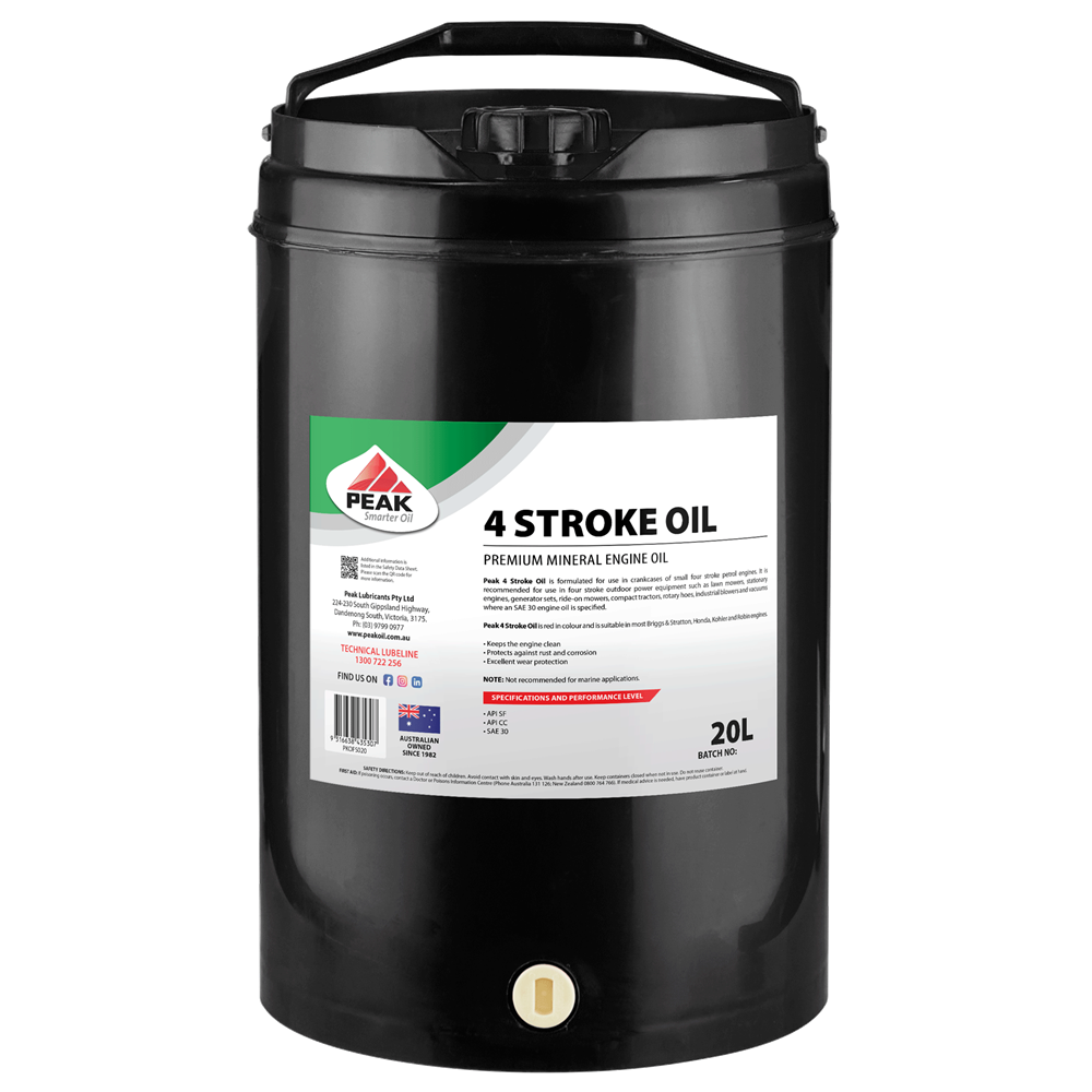 PEAK 4 STROKE OIL is formulated for use in crankcases of small four stroke petrol engines. It is recommended for use in four stroke outdoor power equipment such as lawn mowers, stationary engines, generator sets, ride-on mowers, compact tractors, rotary hoes, industrial blowers and vacuums where an SAE 30 engine oil is specified.