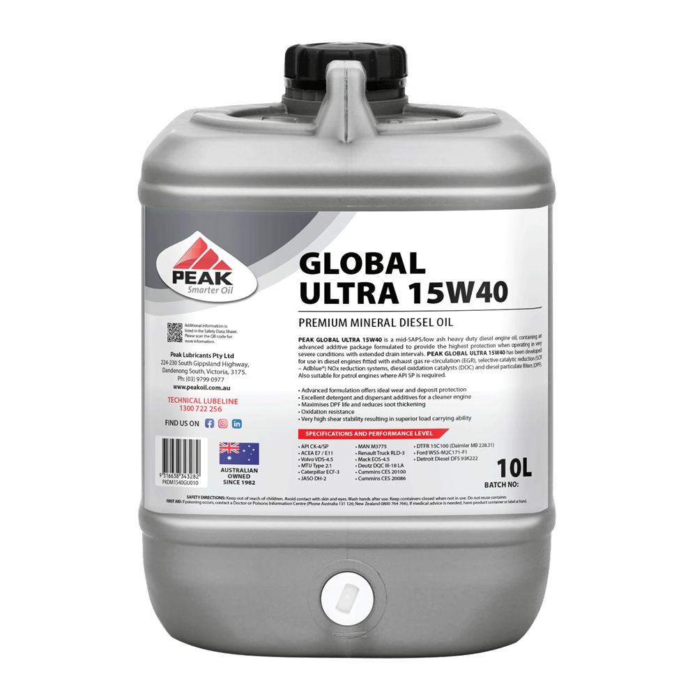 PEAK GLOBAL ULTRA 15W40 is a mid-SAPS/low ash heavy duty diesel engine oil, containing an advanced additive package formulated to provide the highest protection when operating in very severe conditions with extended drain intervals.
