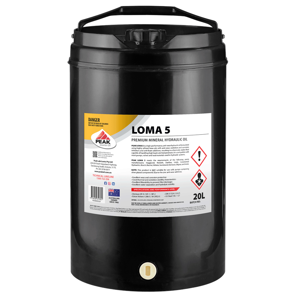 PEAK LOMA 5 is a high-performance, anti-wear hydraulic oil formulated using highly refined base oils with anti-wear, oxidation and corrosion inhibitors and anti-foam additives, resulting in a thermally stable fluid capable of handling high loads and temperatures. It is compatible with most pumps, valves and seal materials used in hydraulic systems.